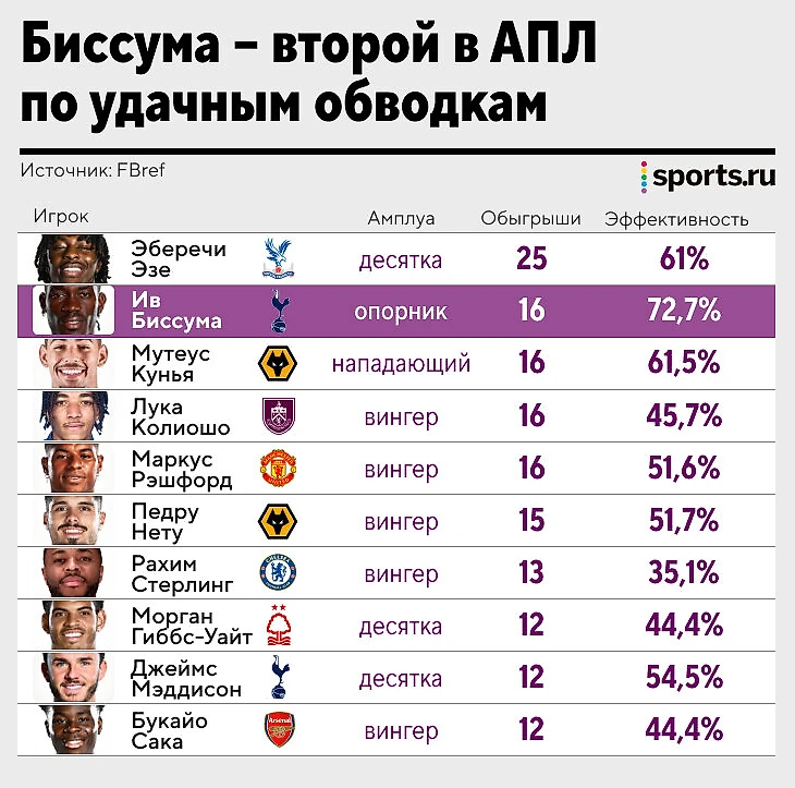 Яркость, отраженная в статистике, – дриблинг опорника «шпор». По успешным обводкам Биссума – второй во всей АПЛ. Оцените топ-10. Биссума окружают игроки, для которых обыгрыш – естественное продолжение атаки. Ив – единственный в списке опорник, но при этом эффективность его попыток зашкаливает. Учитывайте и риски, на которые он идет, – не менее важный фактор, чем частота.