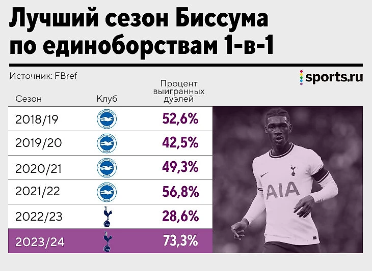 Ее пик проявляется по оборонительным метрикам. Биссума – монстр, когда нужно отобрать мяч. Достает до него, даже когда соперник выставил корпус. Сейчас у Биссума лучший в карьере показатель дуэлей 1-в-1. Можно списать на малую выборку, но взрыв с приходом Постекоглу – точно не совпадение. Грэм Поттер, работавший с Биссума в «Брайтоне», рассказывал, что лучшие качества африканца раскрываются в команде, которая играет первым номером. При Конте о таком оставалось только мечтать.