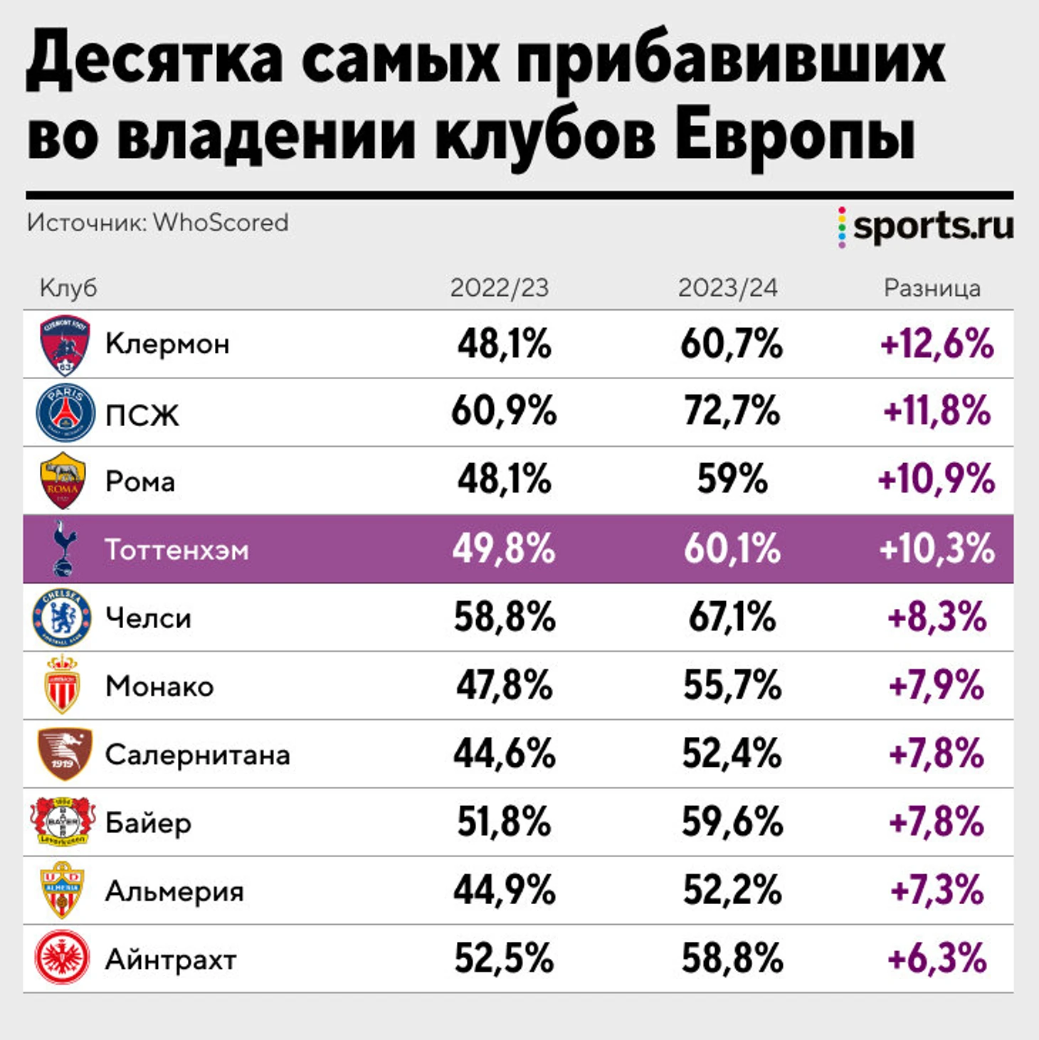 Недостаток неплохо дал о себе знать в первом тайме игры с «МЮ», когда Биссуму разрывал Бруну Фернандеш. В других матчах это тоже проявлялось, но лишь эпизодически. Причина – стиль, который минимизирует такие эпизоды. «Тоттенхэм» – одна из четырех команд в ведущих лигах, которая добавила больше 10% к владению. У соперников просто меньше возможностей надавить на слабое место опорника.
