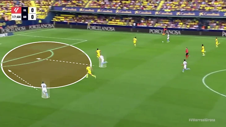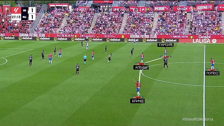 Это скорее фишка из прошлого сезона. Тогда команда была менее вариативной, а этот прием часто становился основным. На правом фланге «Жирона» выстраивает треугольник из вингера, крайнего защитника и центрального полузащитника с постоянными ротациями. Эталонный пример такого взаимодействия – Трент, Хендерсон, Салах.