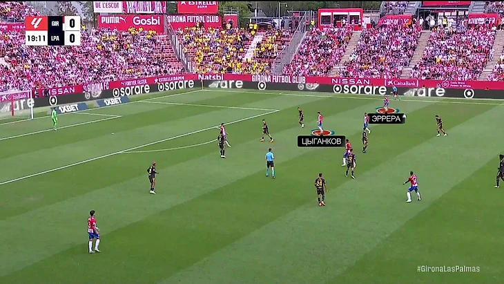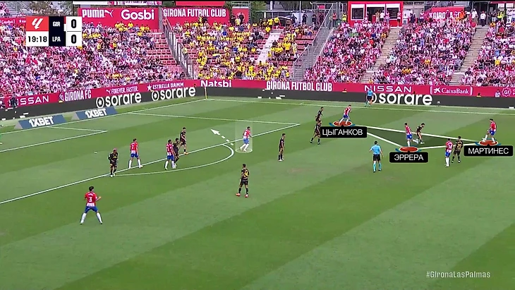 В рамках таких треугольников есть два ключевых принципа – взаимозаменяемость по зонам и вариативность в ролях. Футболисты должны заполнить три роли – вспомогательные рывки, продвижение мяча, креативные функции. В «Жироне» треугольник выстраивается из Арнау Мартинеса, Янгеля Эрреры и Виктора Цыганкова.