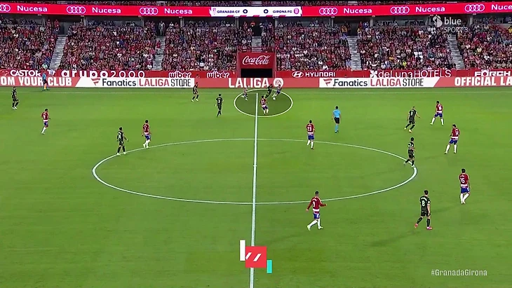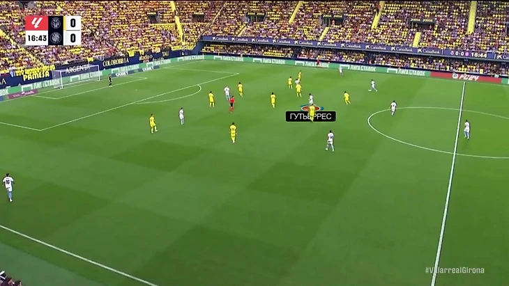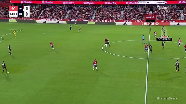 «Жирона» на достойном уровне организована без мяча. Давят в схеме 4-4-2, к форварду выдвигается игрок из центра полузащиты. На своей половине поля выстраиваются в 4-1-4-1. Вполне стандартный набор. Не хочется отмахиваться от работы, которая ведется над этими стадиями (все весьма слаженно и качественно), но нет ничего цепляющего глаз. Таких команд десятки.