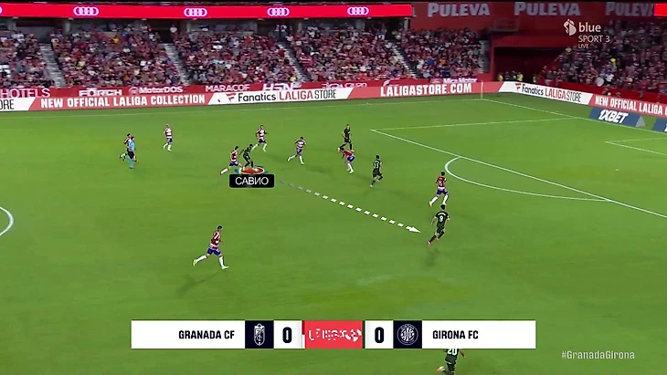 Вторая фишка «Жироны» – вариативность при выборе структуры владения, когда первую волну давления прошли (или соперник решил не давить). Самый частый вариант в первой стадии – трансформация на 3+2 по типу «Арсенала». Правый защитник остается рядом с центральными, а левый поднимается к опорнику: