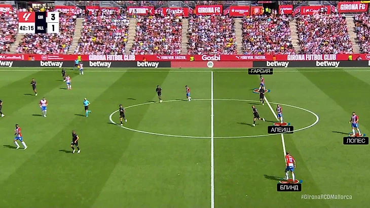 Это базовый вариант, но часто Мичел придумывает что-то под соперника. Яркий пример – недавняя встреча против «Мальорки» (возможно, главный автобус лиги). Было бы странно разыгрывать мяч против них, как против более активных оппонентов. Здесь «Жирона» регулярно расставлялась по схеме 1+3 (1 защитник и 3 игрока в опорной):