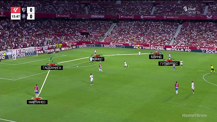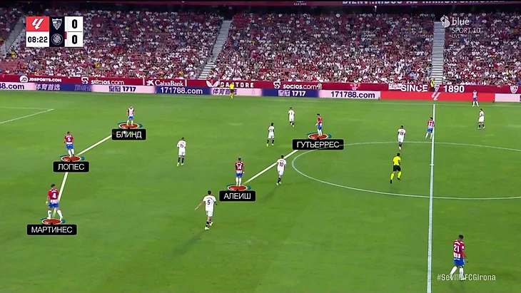 Блинд (в этом матче левый защитник) и Эрик Гарсия располагались на линии с опорником Алеишем Гарсией, а ниже оставался только ЦЗ Лопес. Правый защитник Коуто шел вперед по флангу – создавал ширину.