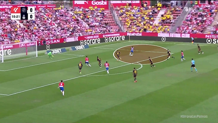 Вратарь используется не просто для отыгрыша под давлением, а в качестве дополнительной единицы в ситуативных схемах. В этом отличие от огромного множества команд, которые просто задействуют кипера в начальной стадии, но все же не делают его частью схемы. Постепенно этот прием подхватывают другие (точно уже было у «Сити» и «МЮ» в отдельных матчах), но «Жирона» использует его наиболее фанатично и весьма вариативно.