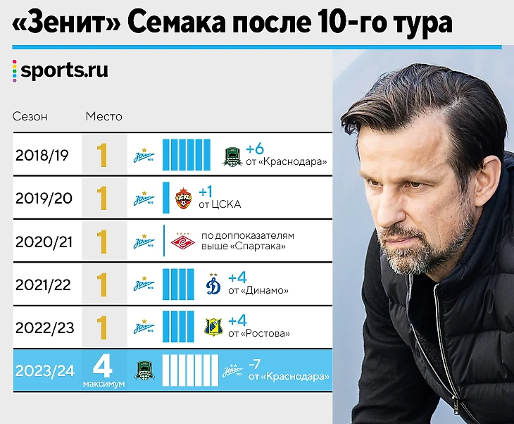 «Зенит» набрал лишь 17 очков после стартовых 10 туров – их худший старт с сезона-2011/12, когда было 16 очков. При Сергее Семаке ранее никогда не набирали меньше 21 очка.