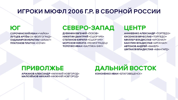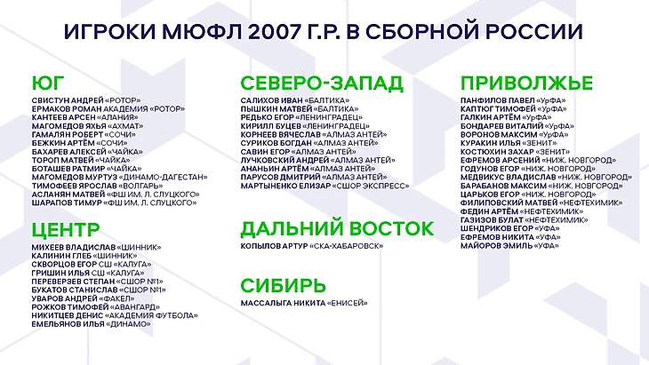 В целом, приглашения игроков из региональных команд в сборные своих возрастов – редкое явление. Например, в 2019 и 2020 годах, за два года до создания Межрегиональных ЮФЛ, в сборную 2004 г.р. из региональных школ вызывалось только трое игроков – Иван Пяткин из «Ротора», Иван Зазвонкин из «Тюмени» и Артур Касабов из «Анжи».