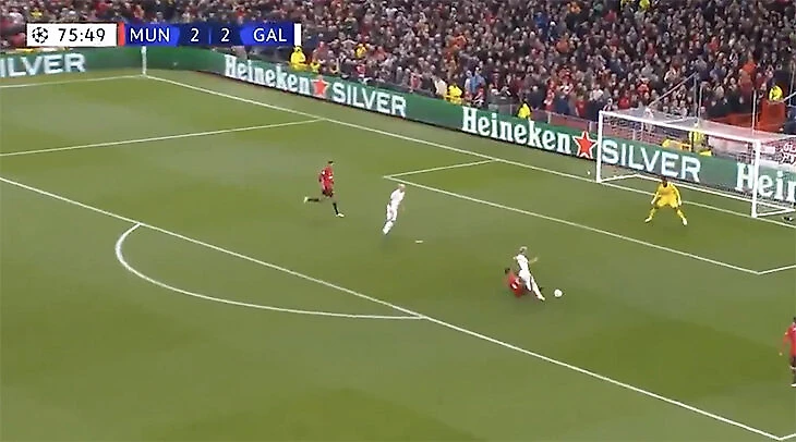 Каземиро опередил Дрис Мертенс, игроку «Юнайтед» пришлось бороться за мяч в штрафной, рисковать в подкате.