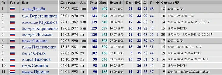 Кажется, лучший бомбардир чемпионатов России снова зафиксировался на годы, ведь за Веретенниковым и Дзюбой – пропасть. У ближайшего преследователя из действующих футболистов (а это Федор Смолов) – 108 голов.