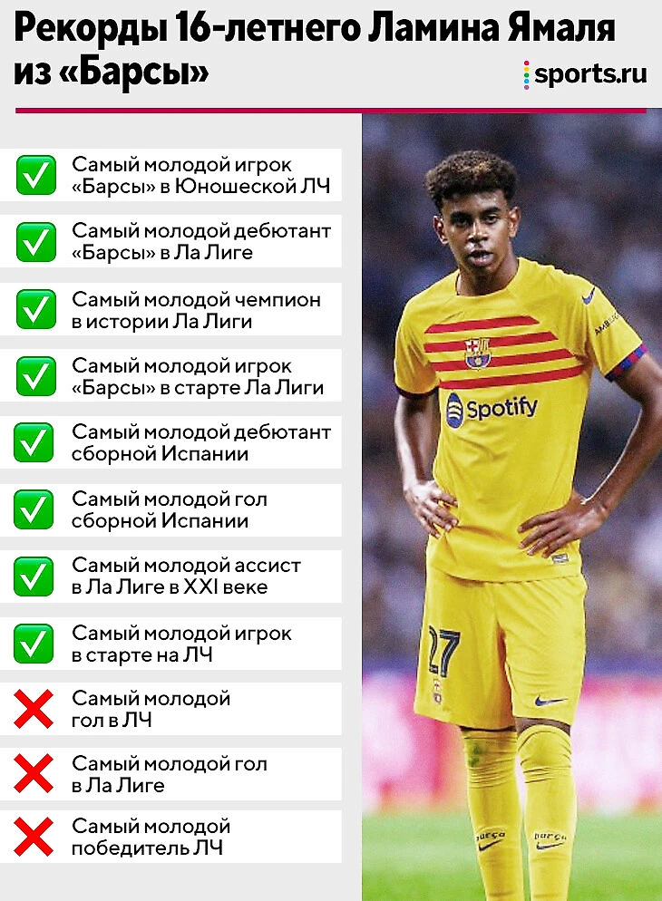 ● 15 лет и 45 дней – самый молодой игрок «Барсы» в Юношеской ЛЧ;