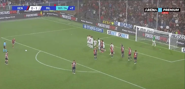 «Дженоа» почти реализовал опасный штрафной: мяч полетел низом, но после рикошета поменял направление. Жиру не среагировал, спасла перекладина!