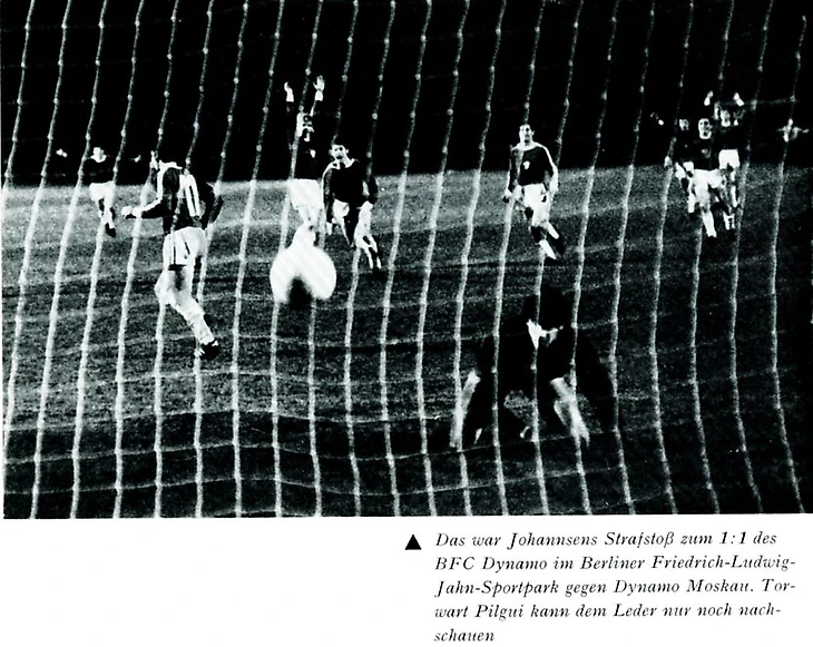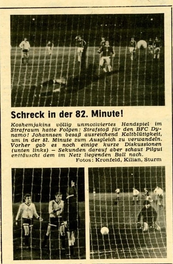 «Необычное и трудно объяснимое происшествие, случившееся в этом матче незадолго до его окончания, придало всей игре драматическую окраску, а московские динамовцы упустили важную победу, которую они в общем-то заслужили. А произошло вот что. На 83-й минуте во время одной из атак берлинцев Жуков выиграл единоборство у соперника, а Кожемякин, который оттянулся на помощь защитникам, неожиданно для всех взял мяч в руки, находясь в своей штрафной площади. Судья, естественно, указал на 11-метровую отметку. Йоханнсен с пенальти сравнивает счет. 1:1»