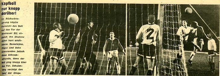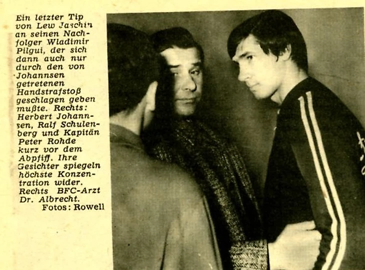 «Голкиперу хозяев Лихсе было явно не до шуток, когда вроде бы надёжные защитники Дитер Штумпф, Вернер Хюбнер и даже капитан команды Йохан Каров раз за разом теряли быстрых игроков москвичей в непосредственной близости от ворот. Так, например, на 17-й минуте Александр Маховиков в своём привычном стиле накрутил и Штумпфа, и Вильфреда Трюмплера, после чего выдал классную передачу Йожефу Сабо, но Лихса мужественно бросился ему в ноги и ценой небольшого рассечения брови ликвидировал угрозу. А ещё через пару минут уже Олег Долматов вышел из-под прессинга Карова, сделав навес на Геннадия Еврюжихина, но последний с пяти-шести метров не попал в ворота»