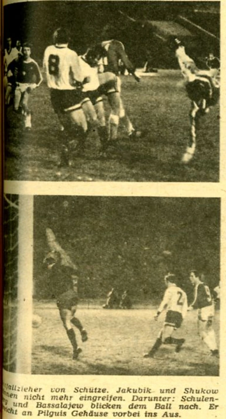 Немецкие футболисты продолжают беспокоить Пильгуя лишь ударами издали. Наиболее опасный из них нанес полузащитник Шютце, но Пильгуй овладел мячом. Был, правда, один момент, когда Долматов упустил Нетца, тот вошел в штрафную, однако Сабо в самоотверженном броске принял удар на себя».