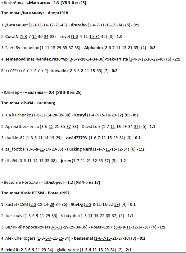 Примечание: В.Негодяи стоят выше Эйфории за счет лучшей разности голов (личная встреча закончилась вничью 2:2). ФБР выше Юпитера благодаря личной встрече (4:1). Места Сорренто, Эльбруса и Мантиссы определялись по разнице мячей.
