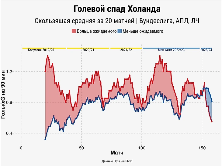 Главный вывод – впервые в карьере Холанд забивает меньше ожидаемого. Обычно его реализация – одна из лучших в мире, а сейчас он завершает моменты хуже, чем в среднем это делают другие футболисты.