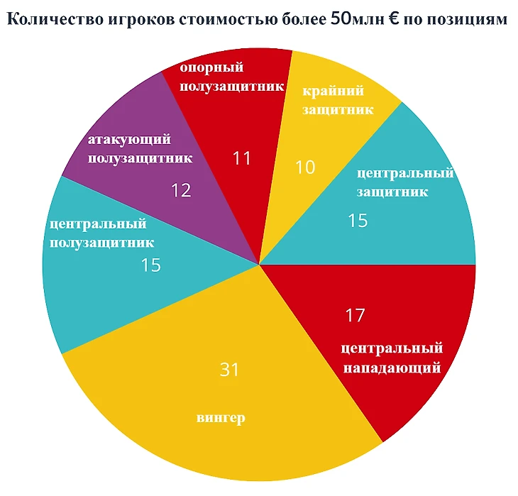 Ожидаемо, что самые дорогие футболисты - игроки нападения. Однако интересно то, что количество вингеров практически в 2 раза больше, чем центральных нападающих. Это можно объяснить тем, что суммируются и правые, и левые вингеры.