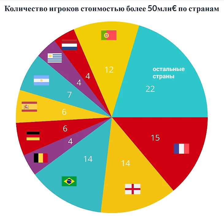 На диаграмме видно, что преобладают 4 страны - Франция, Англия, Бразилия и Португалия. Согласно графику эти сборные имеют самые сильные «поколения футболистов» на данный момент.