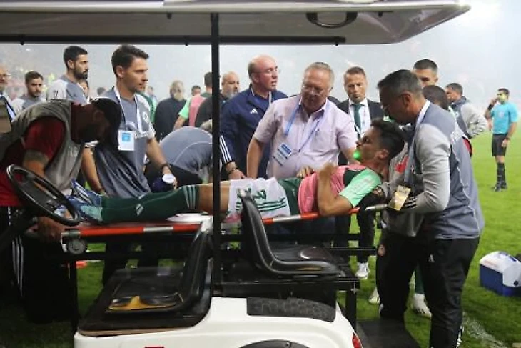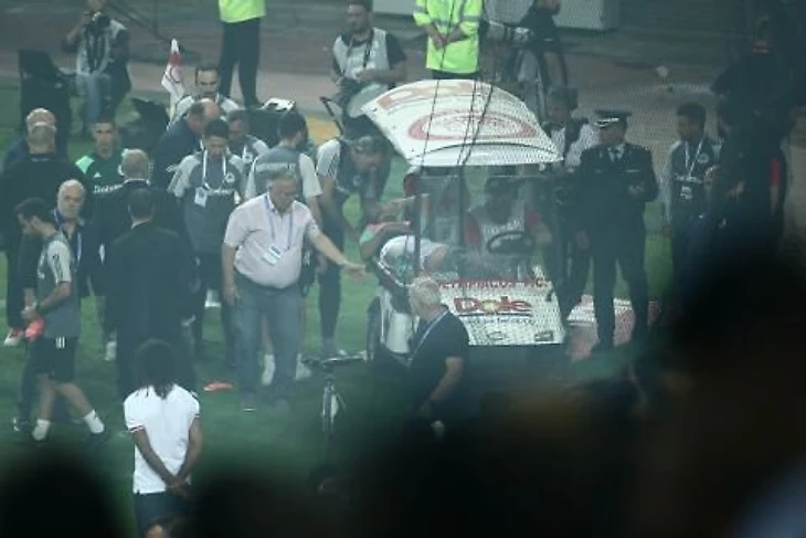 Игрок частично потерял слух из-за петарды, он в больнице, матч не доиграли. Это хайлайты «дерби вечных врагов» в Греции