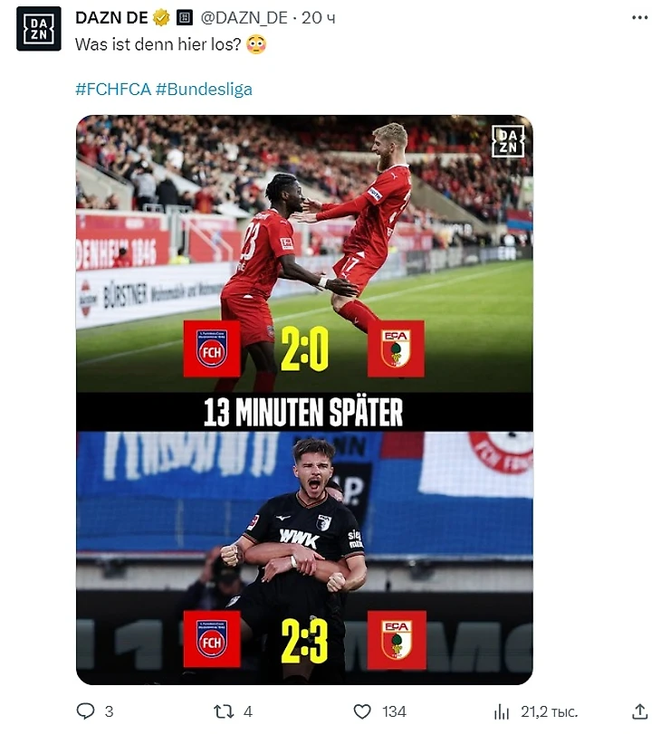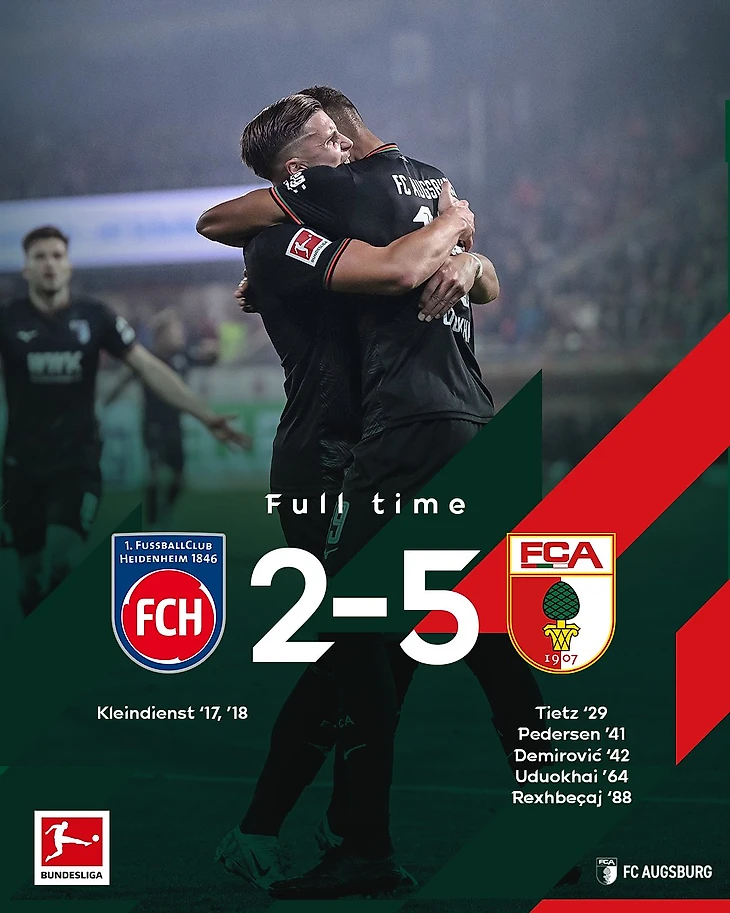 Сумасшедший поединок выдали «Хайденхайм» и «Аугсбург». Хозяева в середине тайма в течение минуты дважды поразили ворота соперника. «Фугеры» впоследствии один гол отквитали, а незадолго до перерыва также в течение минуты забили еще дважды. После перерыва новичок Бундеслиги значительно прибавил, но... пропустил еще дважды. 5:2 – Аугсбург прервал свою безвыигрышную серию и обошел Хайденхайм в таблице, поднявшись сразу на 10 место в лиге.