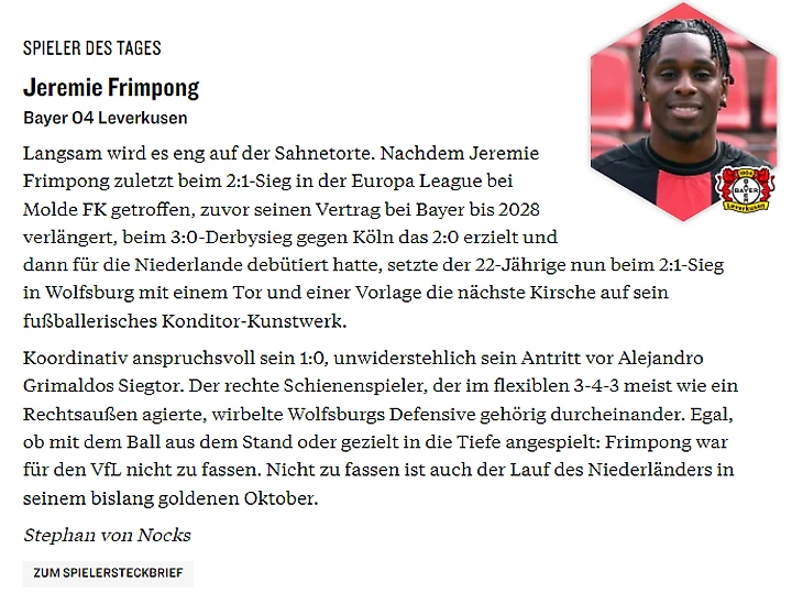 Несмотря на все вышесказанное «Байер» продолжил побеждать в Бундеслиге, на этот раз хоть и с трудом, но одолев Вольфсбург. Сумасшедший матч выдал Бонифасе, но почти все его сольные проходы заканчивались неудачами из-за игнорирования большинства партнёров. А вперед леверкузенцев в итоге вывел Фримпонг на 13 минуте. Лакруа до перерыва сравнял счет, но после перерыва Гримальдо принес «фармацевтам» победу.