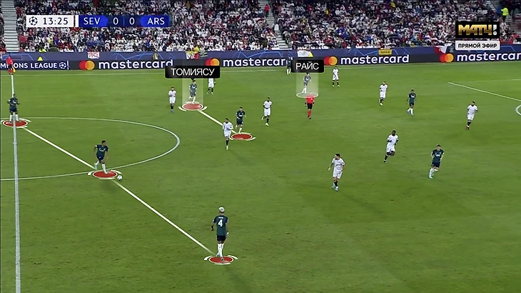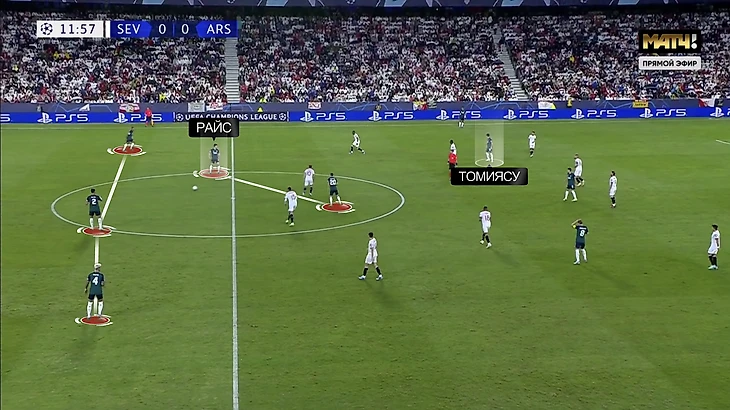 Второй – Райс остается в опорной, а позицию Джаки занимает Томиясу. Что-то подобное мы видели после выхода японца на замену в матче с «Сити» (тогда защитник даже помог в голе). Против «Севильи» таких эпизодов было намного больше: