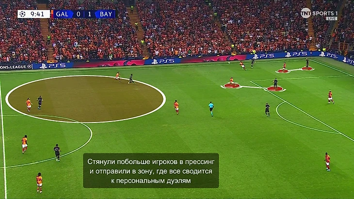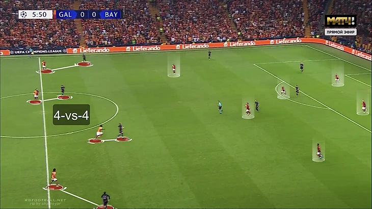 Просто оцените смелость: в давление у «Галатасарая» шли сразу шесть игроков, в том числе пара опорников. Сзади постоянно образовывалась ситуация 4-в-4 – максимально рискованное соотношение, учитывая качества соперников. От защитников требовались и отвага, и чтение эпизодов, чтобы «Бавария» не смогла наказать.