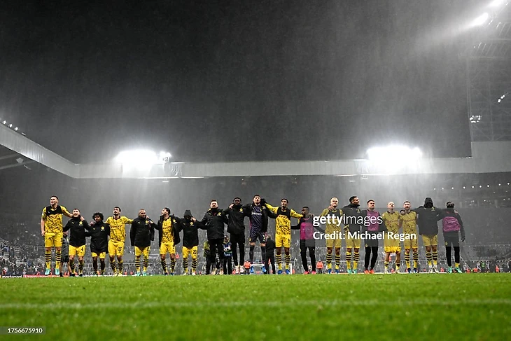 «Боруссия» же наоборот сыграла крайне собранно, дисциплинированно и эффективно, результатом чего стал гол Феликса Нмечи в самой концовке первой половины игры. На трибунах соотношение сил было аналогичным происходящему на поле – местные вяло пытались гнать игроков «сорок» вперёд, тогда как прожженные опытом немецкие ультрас слаженно и громко поддерживали своих под несмолкаемые стуки барабанов. К тому же, перед матчем они умело ставили на место английских болельщиков, провоцировавших их различными жестами и выкриками по пути на стадион.