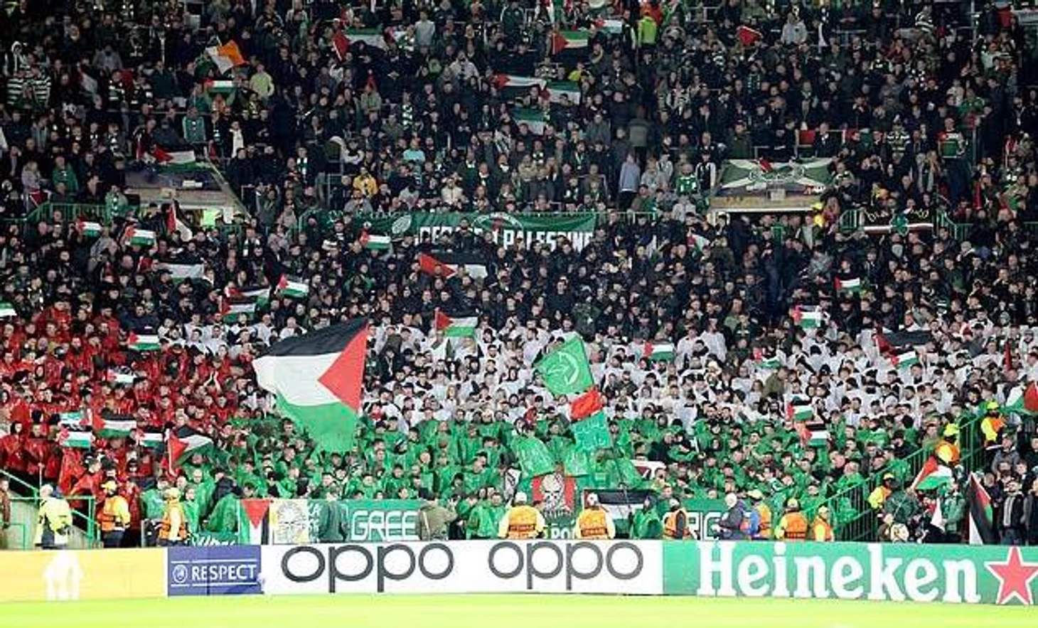 Сразу перенесёмся в группу Е, где всё внимание было приковано к матчу «Селтик»-«Атлетико» из-за ярко выраженной позиции ультрас «Селтика» на палестино-израильский конфликт. О прошлых акциях ультрас-группы «Green Brigade», равно как о реакции других фанатских движей в мире я уже рассказывал буквально позавчера ТУТ, теперь же посмотрим на то, как шотландские фэны отреагировали на запрет руководства клуба демонстрировать политические пристрастия на «Селтик Парк» в этот вечер. Реакция радикально настроенных фанатов оказалась ожидаемой: во-первых, они развернули на своём секторе сотню палестинских флагов, а, во-вторых, фанаты подошли к этому вопросу ещё более креативно, переодевшись на трибуне в дождевики красного, белого, зеленого и черного цветов и встав таким образом, чтобы на секторе визуально получился флаг Палестины.
