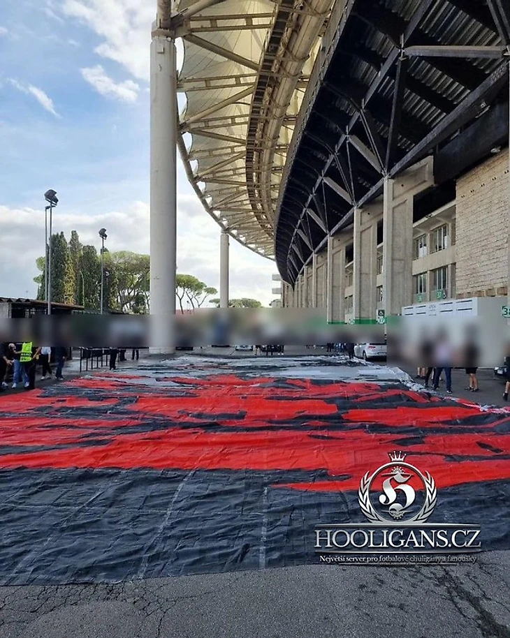 За это чехи будут атакованы на улицах Рима уже после игры – в руки «волков» попадут несколько фанатских толстовок и шарфов «Славии». Но это будет после матча, а на самой игре ультрас «Славии» презентовали довольно неудачный плашечный перфоманс – баннер, который запретили к проносу полицейские, тут явно бы выглядел предпочтительнее.