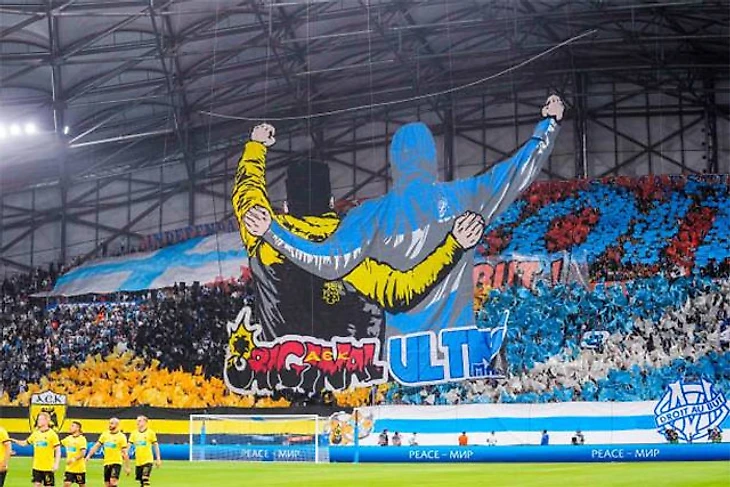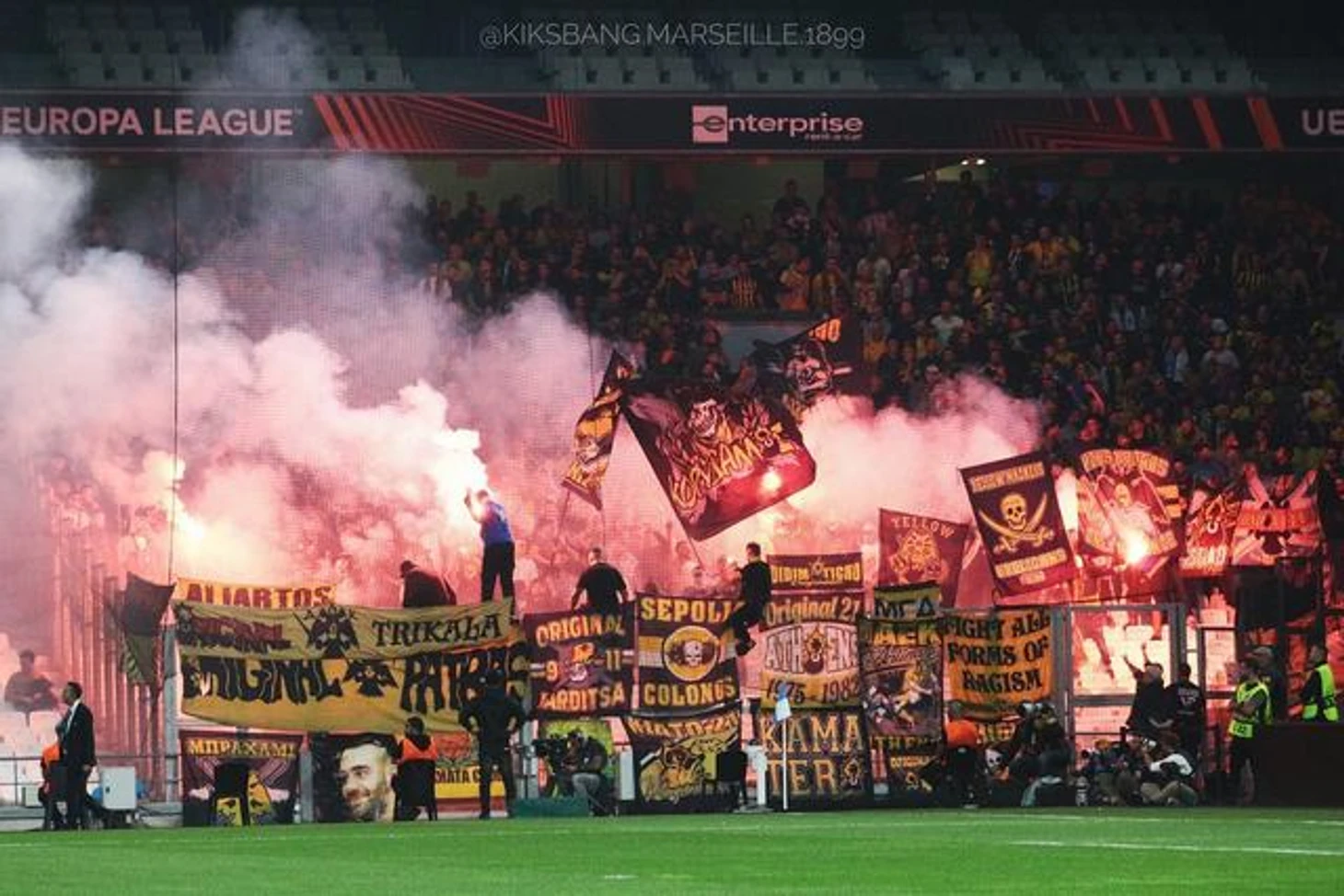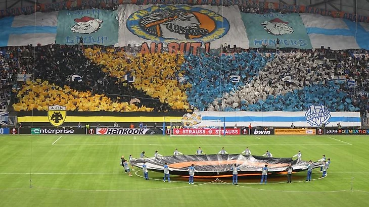 Если во всех предыдущих матчах мы так или иначе говорили о враждебно настроенных друг к другу фанатах, то вот в группе В главным событием, наоборот, стал матч дружеских команд – «Марселя» и афинского «АЕКа». Перед матчем несколько тысяч представителей объединений «Ultras Marseille» и «Original 21» общим кортежем с песнями и пиротехникой прошли до «Велодрома».