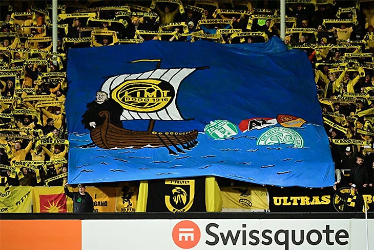 Ну и обзор трибун в самом младшем из еврокубков начнём с группы D, где норвежский «Буде Глимт» принимал у себя грозный «Бешикташ». Норвежские фэны в начале матча развернули баннер, напоминающий всем нам о славном пути этого скромного норвежского клуба в Лиге Конференций в сезоне 2021/2022, когда они выбили в квалификации литовский «Жальгирис» (до этого были повержены исландский «Валюр» и косовская «Приштина»), затем в группе они заняли 2-е место вслед за «Ромой», которую грохнули на своём поле со счётом 6:1, а в плей-офф поочередно выбили сильные «Селтик» и «АЗ» (Алкмар). Только в четвертьфинале «Буде Глимт» споткнулся о ту же «Рому», хоть и выиграл у неё в первой игре со счётом 2:1.