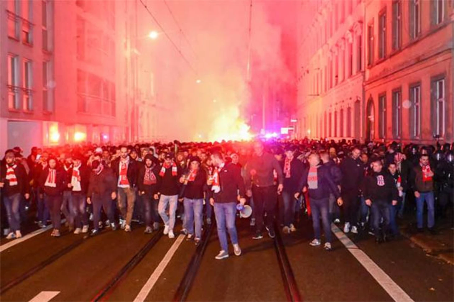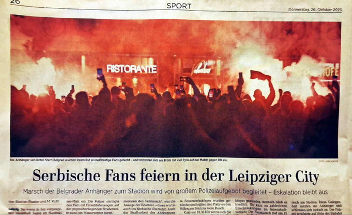 А вот Лейпциг испытал наплыв огромного десанта из Сербии – по разным оценкам их прибыло от 3-х до 4-х тысяч человек. «Делие» прошлись общим составом по городским улицам, скандируя в поддержку России и проклиная НАТО, обеспечили на «Ред Булл Арене» игрокам «Црвены Звезды» потрясающий суппорт, а также немного помяли местных фэнов на стадионе за провокацию с албанским флагом. На миролюбивых и спокойных немцев это произвело настолько сильное впечатление, что уже на следующее утро местные газеты вышли с фотографиями сербских болельщиков на первой полосе.