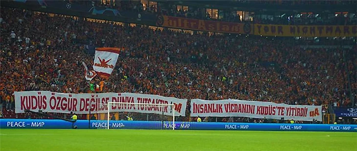 В группе А обошлось без особо громких событий. Фанаты «Галатасарая» из группировки «UltrAslan» на домашней игре против «Баварии» продолжили качать палестинскую тему баннерами «Если Иерусалим несвободен, мир окажется в плену. Человечество потеряло совесть в Иерусалиме» и «Иерусалим – это Кибла, Иерусалим – это Мирадж». Про Киблу я уже рассказывал в посте, посвященному реакции футбольных фанатов на события на Ближнем Востоке, а Мирадж – это ночное путешествие пророка Мухаммада в Иерусалим и одна из главных дат в году для мусульман. Накануне матча, кстати, ночное путешествие мюнхенских фанатов закончилось для них плачевно: когда они отдыхали на главной туристической улице Стамбула Истикляль, на них совершили прыжок турецкие хулиганы, отправившие нескольких немцев на больничную койку. Остальным пришлось спасаться бегством. К счастью, обошлось без таких трагичных последствий, как в 2000 году.
