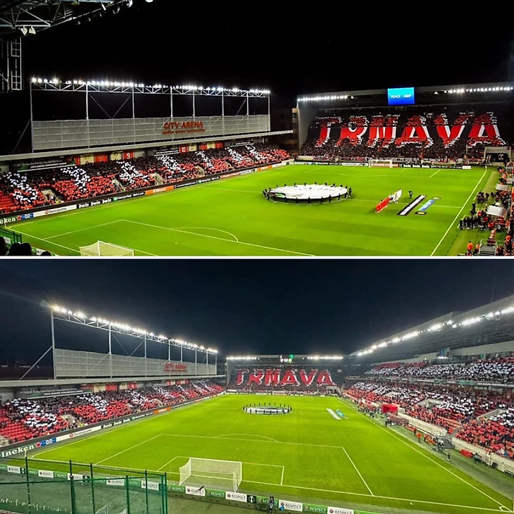 А в другой игре «Спартаку» из Трнавы кровь из носу было необходимо на своём поле побеждать датский «Норшеллан», чтобы догнать и их, и «Лудогорец». Ультрас «Спартака» к этой игре подготовили модульный перф на весь стадион с очень простой фразой «Спартак Трнава» на двух трибунах и красно-белыми модулями на третьей, центральной трибуне.