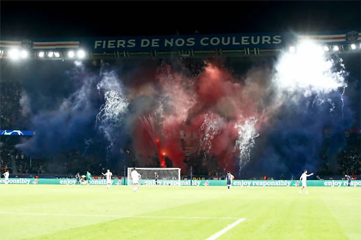 Начнём с группы F, где каждая встреча несёт в себе сумасшедшую интригу. Французский «ПСЖ» принимал на своём поле итальянский «Милан», и группировка «Collectif Ultras Paris» к этой игре подготовила отличную масштабную хореографию с изображением Жан-Поля Бельмондо, стреляющего в находящегося на противоположной трибуне красного дьявола, являющегося символом «Милана». Фоном перфоманса служили флажки в цвета клуба, а также множество файеров.