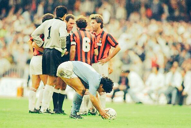 На культовом ломбардийском стадионе сплоченная оборона миланцев зачастую не давала форварду неаполитанцев развернуться, часто действуя персонально с южноамериканцем. Барези и компания зажимали Марадону в жесткие тиски , нарушая правила , играя так , как требовал командный результат — не церемонясь с Идолом «Сан-Паоло» !