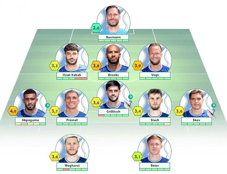 «Хоффенхайм»: Бауманн (c) – Кабак, Брукс, Фогт – Акпогума, Премель, Штах, Бюльтер – Крамарич – Вегорст, Байер