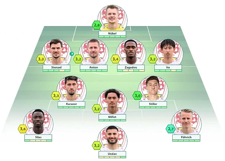 «Штутгарт»: Нюбель – Штенцель, Антон (c), Загаду, Ито – Каразор, Штиллер – Мвумпа, Мийо, Фюрих – Ундав