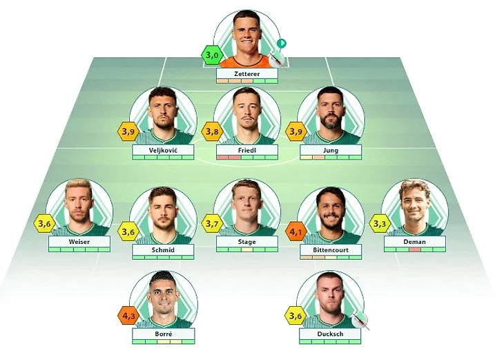 «Вердер»: Цеттерер – Велькович, Фридль (c), Юнг – Вайзер Шмид, Стаге, Виттенкурт, Деман – Борре, Дукш