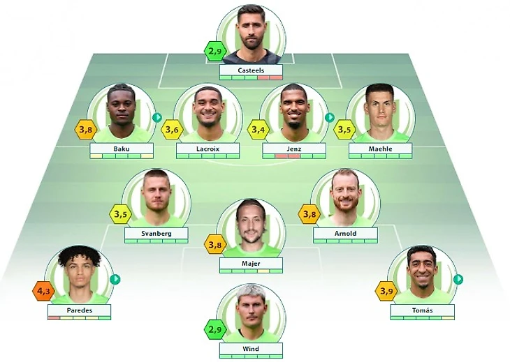 «Вольфсбург»: Кастельс – Баку, Лакруа, Йенц, Мэле – Сванберг, Арнольд (c) – Томаш, Майер, Паредес – Винд