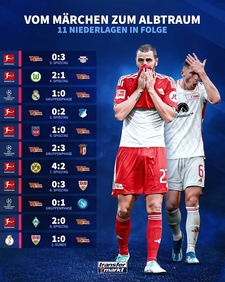 Продолжается кажущееся бесконечным падение «Униона». Три поражения в Лиге чемпионов, семь поражений в бундеслиге – такого крутого пике не показывали даже в «Каламбуре». И вот – вылет из Кубка Германии, как закономерное продолжение черной серии «железных».
