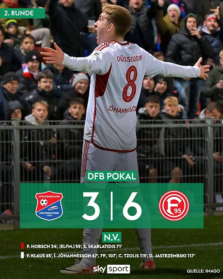 Выход во второй раунд кубка Германии - успех для «Унтерхахинга», а потому от них никто не ждал сюрпризов. По всей видимости, даже гости из Дюссельдорфа к сложной игре не готовились. Первый тайм, на удивление, прошел в равной борьбе, где единственный гол забил Патрик Хобш. Отличились хозяева и довели первый тайм до победного. Во втором тайме в игру наконец включились гости, но для этого они были вынуждены пропустить второй гол от все того же Хобша. 2-0 счет который заставил действовать. На 65-й минуте отличился Клаус, а затем Исак-Бергманн Йоуханнессон счет сравнял. Приключения «Фортуны» не закончились и спустя пять минут они снова оказались в роли догоняющих. Скарлатидис сделал счет 3-2. Однако через восемь минут счет снова стал равным. Дубль оформил Исак-Бергманн Йоуханнессон. 3-3 и команды отправились на дополнительные два тайма с неожиданным для гостей результатом.