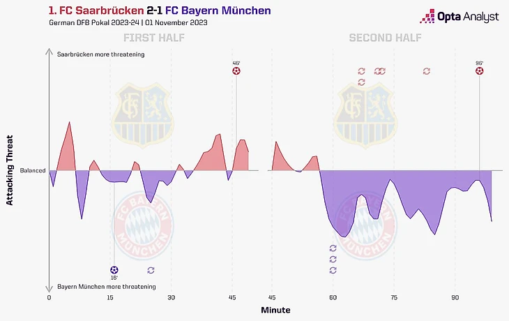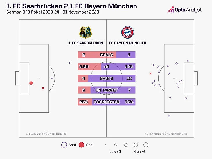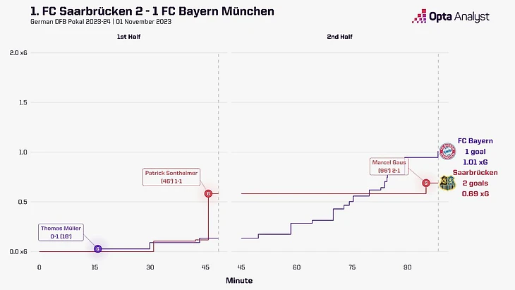 «Саарбрюкен» провел всю игру, особенно второй тайм, исключительно в обороне, что неудивительно, но был поразительно хладнокровен в своих редких моментах, нанося удары в нужное время – в самых концовках обоих таймах. Перед перерывом точный удар получился у Патрика Зонтаймера, а на 96-й минуте Марсель Гаусвписал свое имя в историю. Времени, чтобы отыграться, у «Баварии» уже не оставалось.