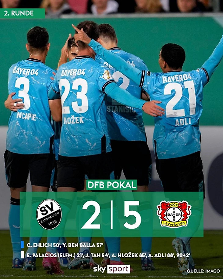 Второй тайм выдался более результативным. Результат на табло напоминал «игру в догонялки». На 50-й минуте хозяева сравняли счет – 1:1. Через четыре минуты гости догнали – 1:2. Через три минуты хозяева сравняли – 2:2. И вроде игра успокоилась, но не тут-то было. Последние десять минут «Байер» забил три безответных мяча, не оставив шансов «Зандхаузену», в итоге 3:5. У хозяев на свой счет мячи записали Кристоф Элих на 50-й минуте, первый навязавший борьбу «Байеру», сравнявший счет до 1:1 и Яссин Бен Балла, который на 57-й минуте почти на двадцать минут подарил хозяевам мечту на ничью в этом матче. К сожалению подопечных Йенса Келлера у «Байера» были другие планы – победа! В роли разрушителей мечты выступили Жонатан Та, который на 54-й минуте ушел от ничьей – 1:2; Адам Гложек, снова убежав от ничьей – 2:3; а финальную точку в матче поставил Амин Адли, оформив дубль – 2:5.