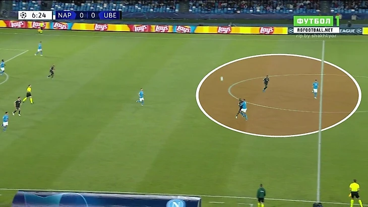 Спонсором открытости выступили свободные атакующие латерали «Наполи». Степень свободы и заточенности на атаку неплохо передает этот момент. Это не хаотичный эпизод после стандарта, а позиционная атака. Мариу Руй и Джованни Ди Лоренцо – соседи по расположению внутри штрафной: