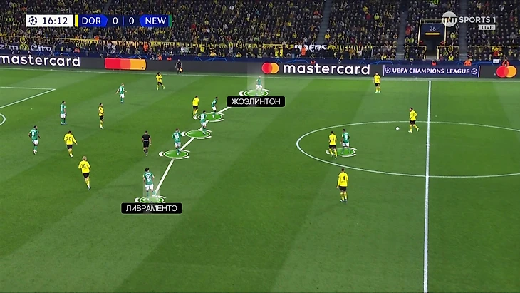 Показательным было наполнение флангов: правым вингером стартовал Тино Ливраменто (правый защитник), а левым – Жоэлинтон (обычно играет в центре полузащиты). Это более оборонительный набор с акцентом на сдерживание на своей половине, а не на высокое давление.