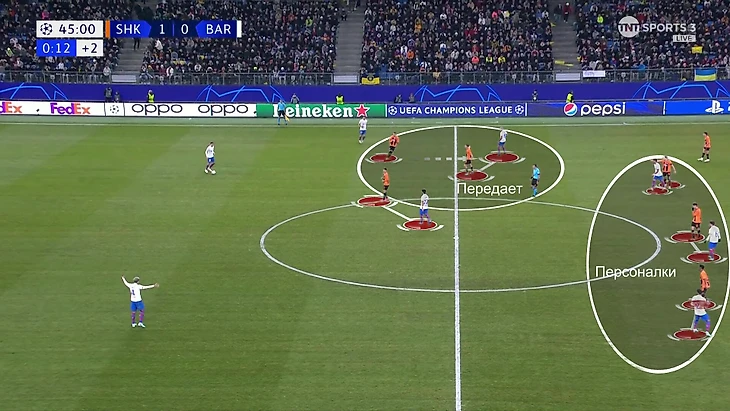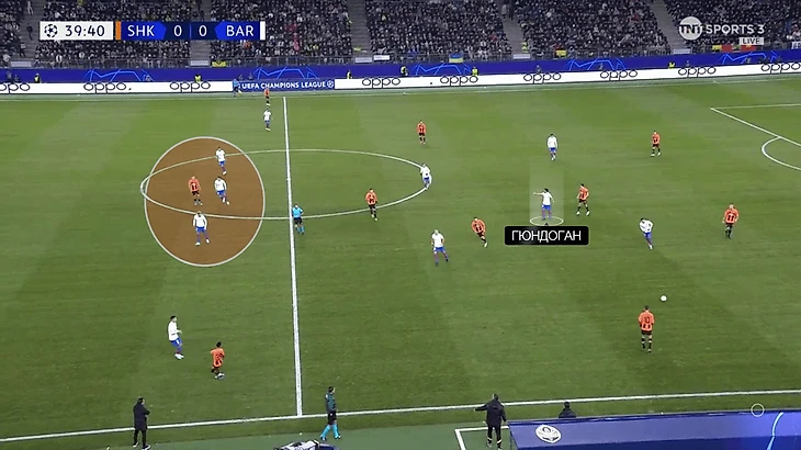 Чтобы выключить центральный блок (Ромеу, Гави, Гюндоган + приходящие Ферран и Канселу), «Шахтер» использовал персональную опеку от пятерки полузащитников и нападающего Сикана. То есть 5 игроков «Барсы» против 6 игроков «Шахтера» с постоянной передачей в зависимости от трансформации.