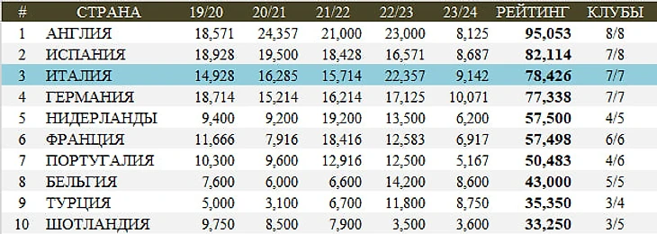 И обходит Турцию с Бельгией в борьбе за получение 5-ой путевки в Лигу чемпионов со следующего сезона. Во многом это стало возможным благодаря выступлениям и бонусам за обеспеченное участие клубов в еврокубковой весне.